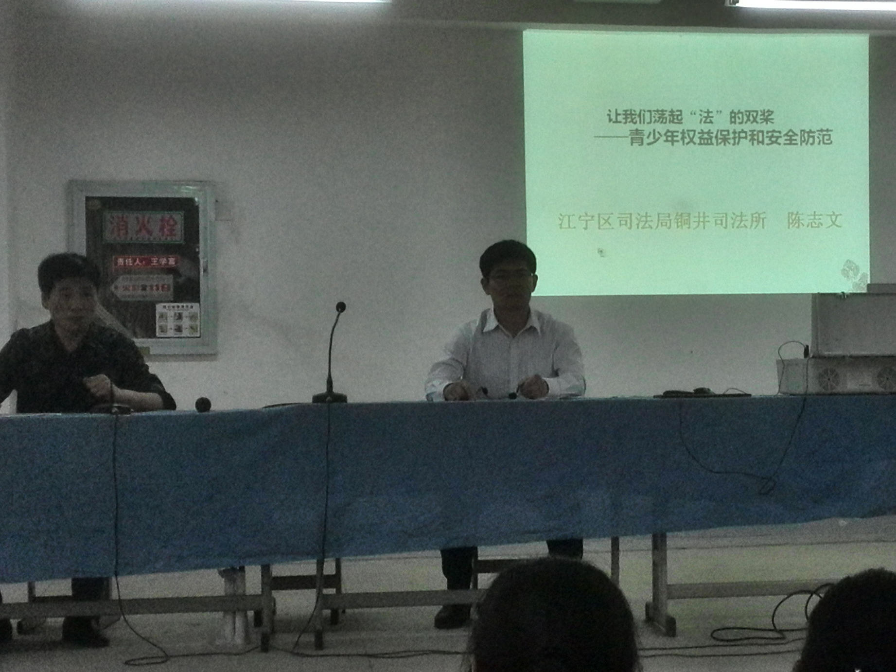 5月6日下午,铜井中学邀请铜井司法所陈志文主任来校作一场生动的法制教育课,陈主任通过五个典型案例就青少年犯罪现状,犯罪性质,犯罪形式,犯罪手段及犯罪成因作详细的分析,同时告知学生怎样来预防青少年犯罪的方法,特别是青少年犯罪的前兆,包括旷课、夜不归宿,到网吧游戏室,携带管制刀具,观看、收听色情、淫秽的音像制品读物等,应远离这些场所和物品。